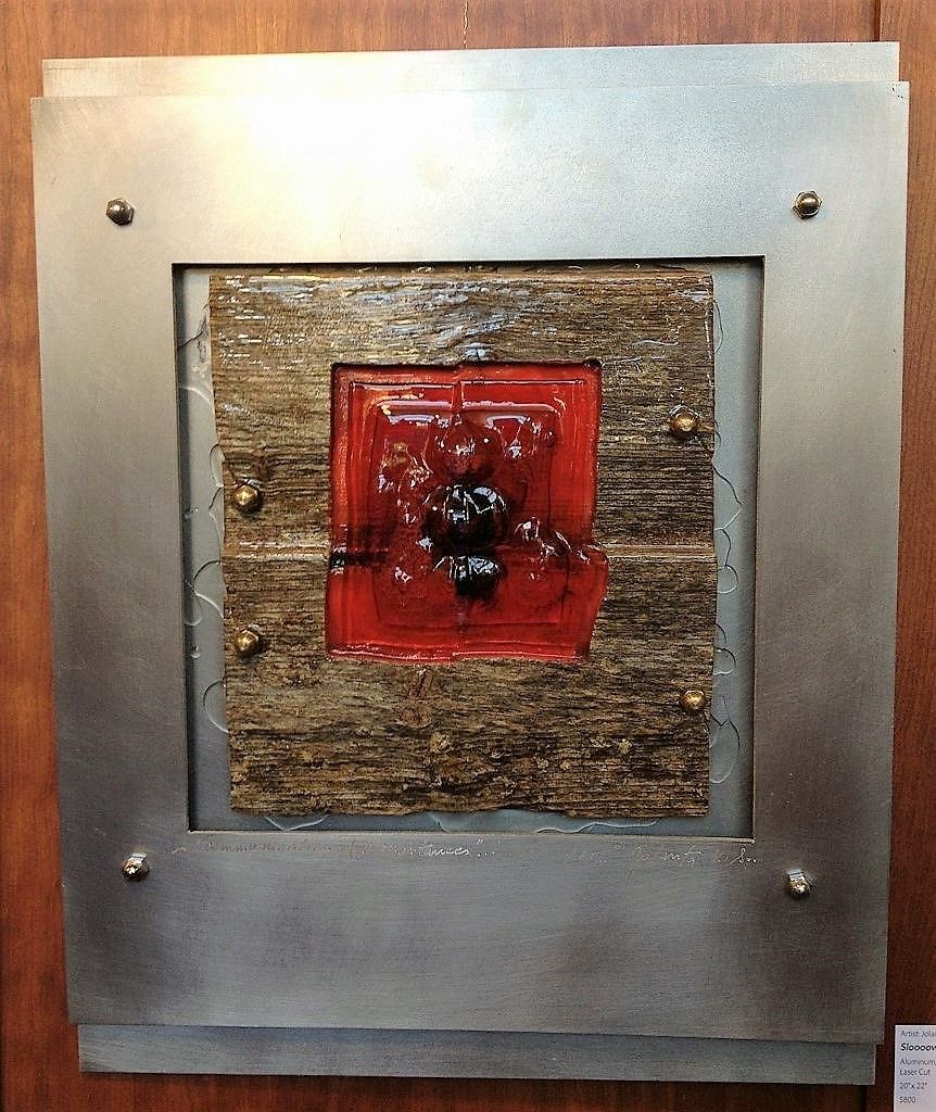 Description: Cut in a piece of wood to precisely match a piece of glass artwork.